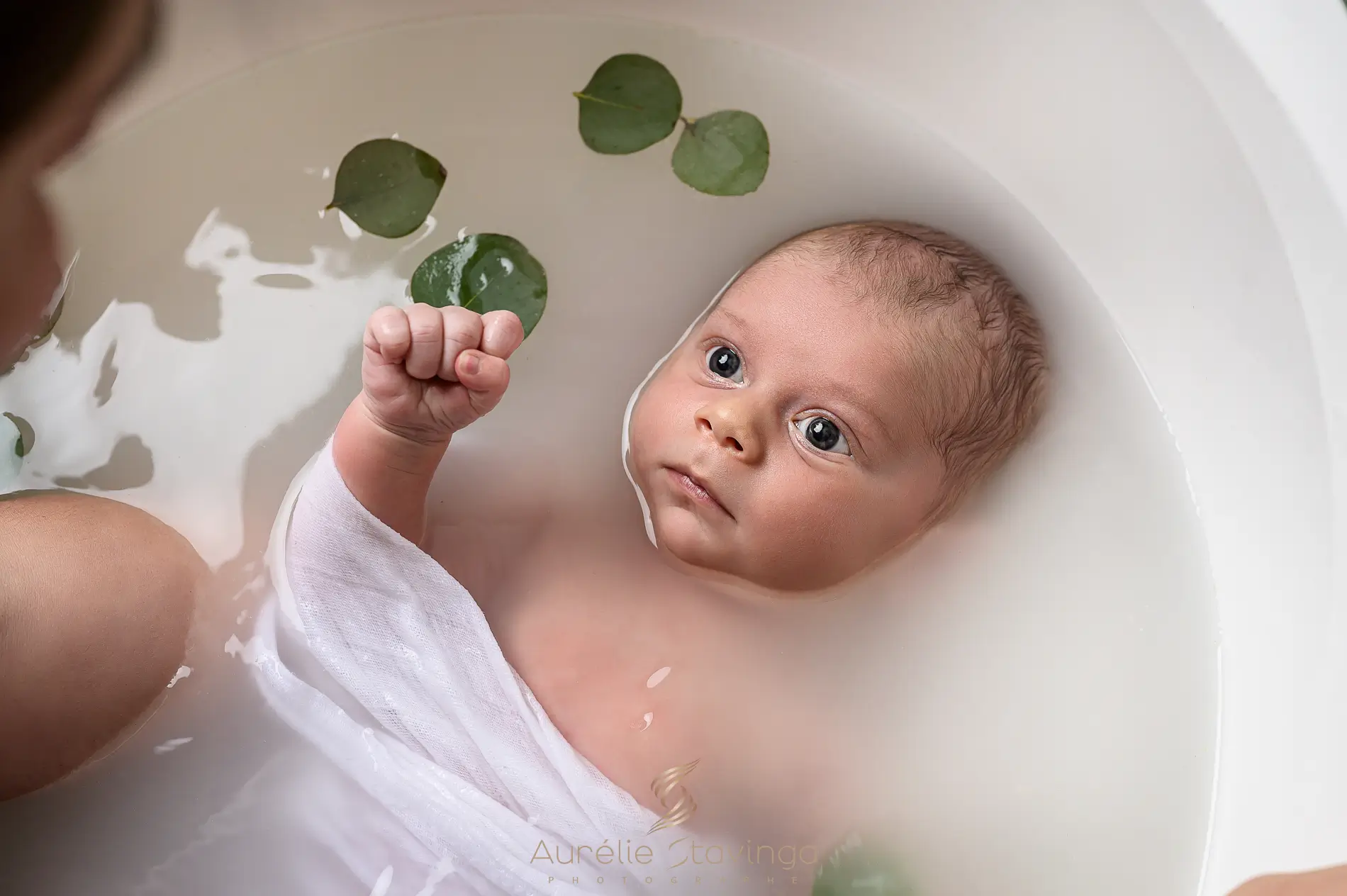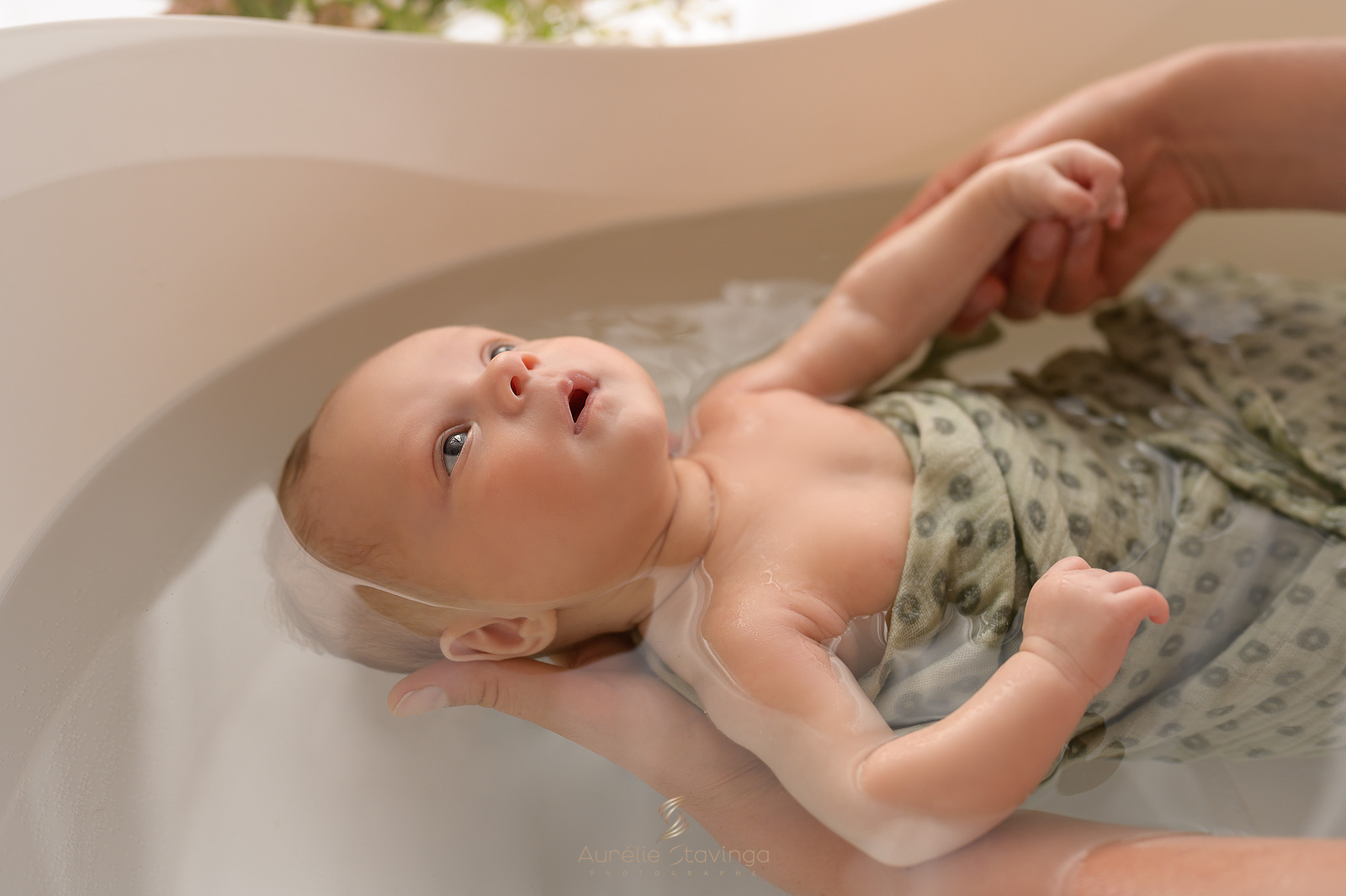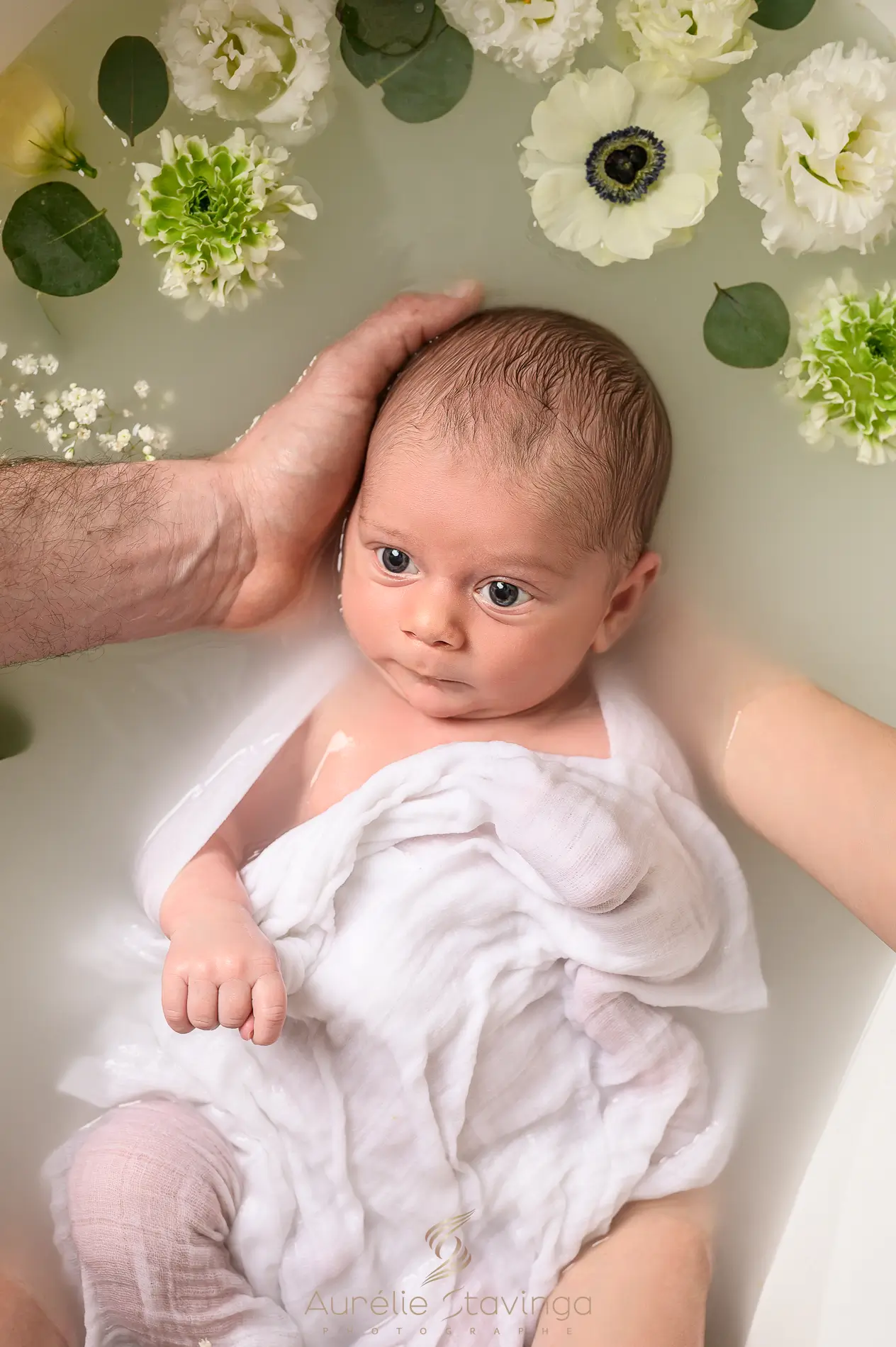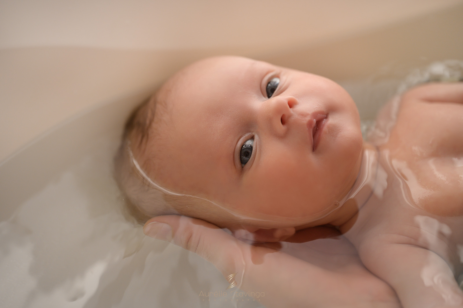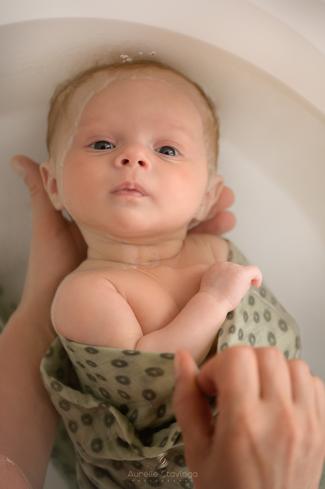 Séance photo bebe bain enveloppé - Voiron, Grenoble et Chambéry